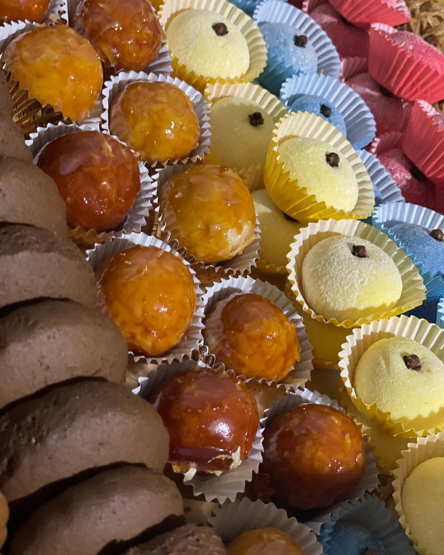 Sweet chocolate made from condensed milk, powdered milk, icing sugar, pigmented in assorted colors and as a decorative element a sweet aromatic clove typical of our region